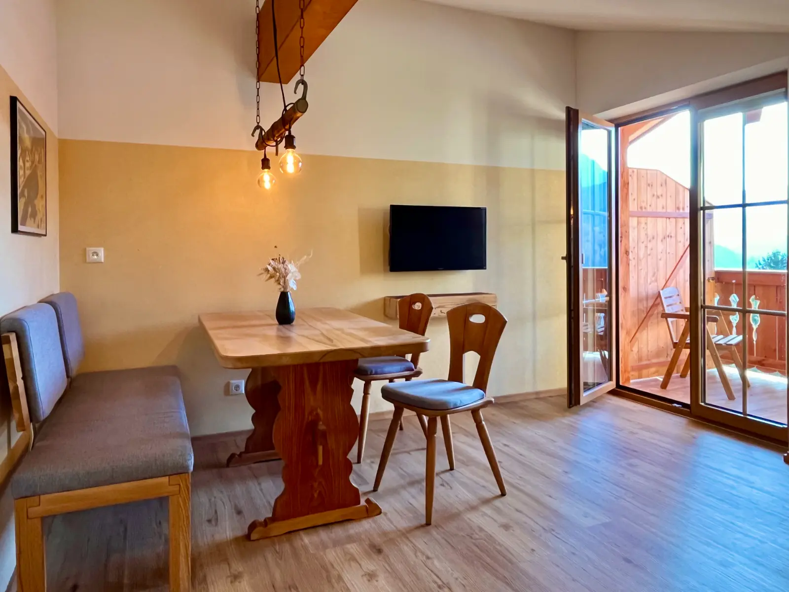 Für romantische Stunden, gemeinsame Mahlzeiten oder auch einfach nur Zeit für Euch alleine, um die Seele baumeln zu lassen, bietet sich auch der Balkon an, der vom Wohn- und Essbereich zugängig ist.